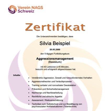Eine genaue Beschreibung finden Sie hier: https://nags.ch/wp-content/uploads/2023/06/Grundkurs-Aggressionsmanagement-NAGS-05-23.pdf